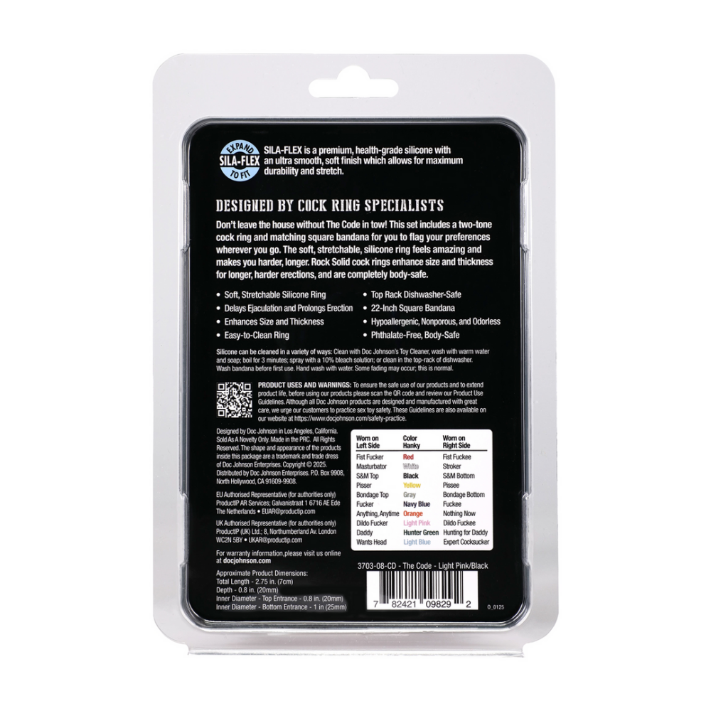 Don't leave the house without The Code in tow! This set includes a two-tone cock ring and matching square bandana for you to flag your preferences wherever you go. The soft, stretchable, silicone ring feels amazing and makes you harder, longer. Rock Solid cock rings enhance size and thickness for longer, harder erections, and are completely body-safe.