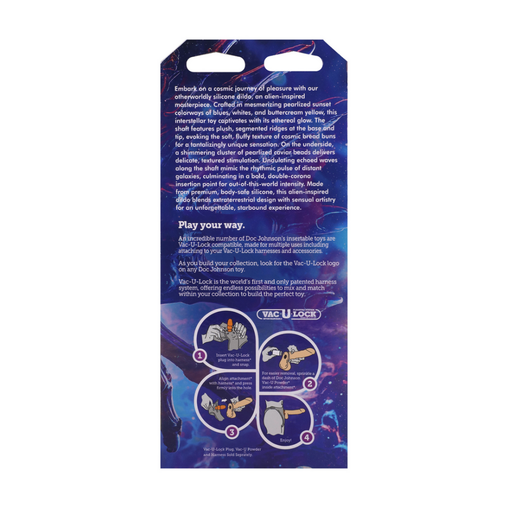 Embark on a cosmic journey of pleasure with our otherworldly silicone dildo, an alien-inspired masterpiece. Crafted in mesmerizing pearlized sunset colorways of blues, whites, and buttercream yellow, this interstellar toy captivates with its ethereal glow. The shaft features plush, segmented ridges at the base and tip, evoking the soft, fluffy texture of cosmic bread buns for a tantalizingly unique sensation. On the underside, a shimmering cluster of pearlized caviar beads delivers delicate, textured stimulation. Undulating echoed waves along the shaft mimic the rhythmic pulse of distant galaxies, culminating in a bold, double-corona insertion point for out-of-this-world intensity. Made from premium, body-safe silicone, this alien-inspired dildo blends extraterrestrial design with sensual artistry for an unforgettable, starbound experience.