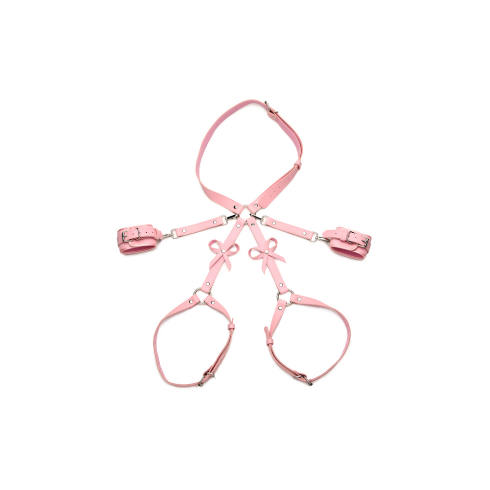 L'utilisation de votre corps est un cadeau traitez-le comme tel avec ce harnais de bondage et enveloppez votre taille, vos cuisses et vos poignets comme un joli petit paquet - il comprend même des nœuds ! Fabriqué en cuir synthétique PU rose et durable, il est respectueux des animaux et facile à nettoyer ou à essuyer après chaque utilisation. Les menottes se ferment à l'aide de boucles en métal argenté sans nickel. Ajustez les boucles sur les sangles de cuisse, la sangle de taille et les menottes pour un ajustement personnalisé et confortable. Accentuez vos courbes et faites saliver votre partenaire de désir et de passion en vous présentant comme l'objet de leur admiration, un partenaire lié et soumis prêt à pimenter la nuit ! Attachez-vous ou, mieux encore, laissez votre partenaire vous mettre ses contraintes ! À chaque boucle qui serre une sangle, profitez de la sensation d'être lié. Même symboliquement, votre esprit peut commencer à se tourner vers l'idée d'être soumis et réceptif à des idées merveilleuses, délicieuses et déviantes que vous pourrez explorer tous les deux ! Assurez-vous que ce n'est pas trop serré pour ne pas entraver votre circulation sanguine. Avec vos poignets tirés derrière votre dos par les sangles, mettez-vous à genoux devant votre partenaire pendant qu'il joue le rôle de Monsieur, Madame, Dominant, ou même Papa ! Incluez vos jouets préférés et procédez aux préliminaires pour vraiment rendre cette scène riche et sensuelle ! Après utilisation, nettoyez toute partie du harnais qui nécessite une attention particulière avec un chiffon doux et un nettoyant pour jouets. Mesures : La taille s'ajuste d'un tour de 66 cm à 107 cm. Les cuisses s'ajustent d'un tour de 33 cm à 66 cm. Les menottes s'ajustent d'un tour de 14,5 cm à 26 cm. Matériaux : Cuir PU, métal. Couleur : Rose, argent. Caractéristiques clés : Magnifique bondage : Profitez de la façon dont ce harnais restreint votre taille, vos cuisses et vos poignets avec des sangles et des menottes. Des petits nœuds accentuent l'arrière de vos cuisses ! Cuir PU : Fabriqué en cuir synthétique PU durable et respectueux des animaux. Nettoyage ponctuel au besoin. Boucles réglables : Toutes les sangles sont réglables via les boucles et les trous. Métal sans nickel : Le métal utilisé est sans nickel et sûr pour le corps.