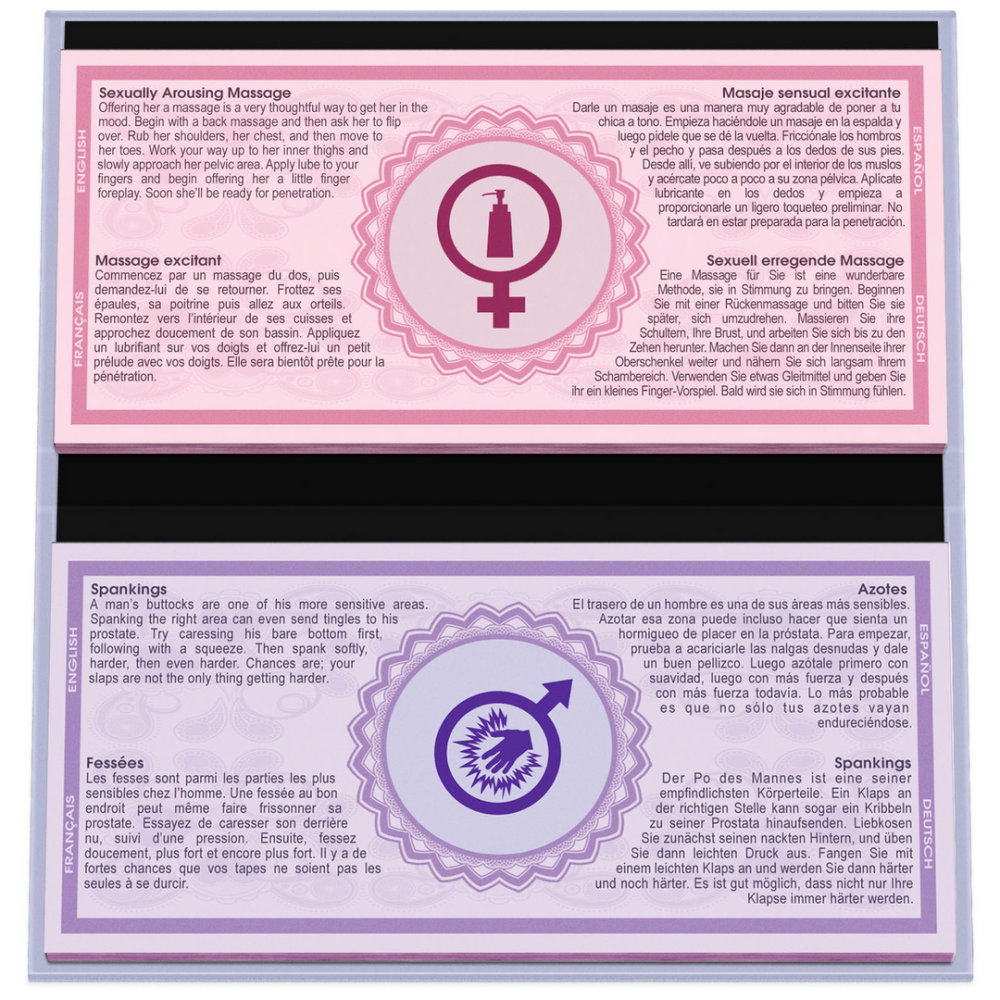 Chaque semaine, choisissez une carte conseil à partager avec votre partenaire. Alternez les techniques Pour Lui et Pour Elle. Commencez par profiter de quelques préliminaires et techniques sensuelles, puis progressez tout au long de l'année vers des techniques de séduction plus créatives et stimulantes. Les résultats sont absolument orgasmique.
