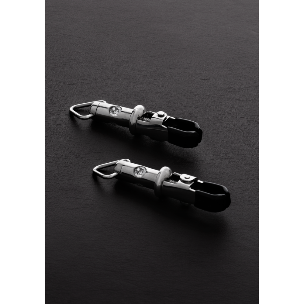 Ces pinces résistantes sont équipées de poignées en zircon cubique et d'un anneau de suspension dans leur base qui vous offre une infinité d'options de bondage. Les anneaux sont parfaits pour attacher des cordes ou des chaînes afin de créer n'importe quelle type de torture des tétons que vous pouvez imaginer. Les pinces sont réglables en hauteur grâce à leurs fûts filetés.