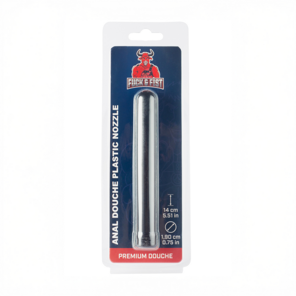 Anal enema tip with an insert length of 13.5 cm and a width of 1.9 cm. Several holes at the end for jet output. Smooth surface. Made of ABS plastic. Attaches directly to shower hose.
