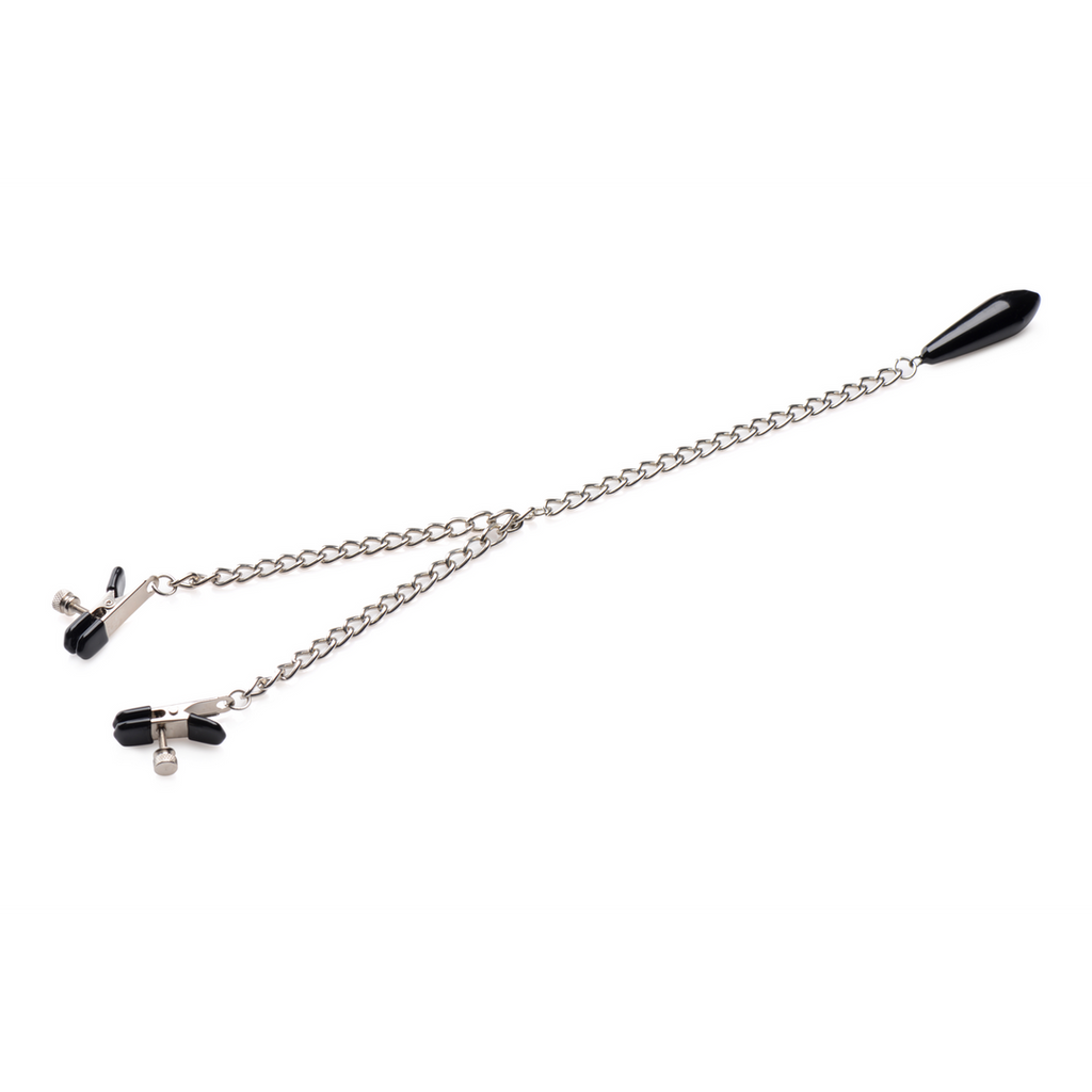 Fixez sur les mamelons de votre partenaire et tirez avec la perle de poids incluse ! Ce Titty Taunter est idéal pour les couples qui aiment jouer avec les mamelons - les pinces à embout en caoutchouc offrent une pincée satisfaisante sans inconfort et le tirage supplémentaire de la perle lestée satisfait vos mamelons sensibles à chaque petit mouvement ! Ajustez la pression de pincement en tournant les vis ! Serrez suffisamment pour maintenir ces pinces sur le mamelon pendant que la perle de 2,1 onces les tire vers le bas - parfait pour les passionnés de BDSM et de bondage de tous niveaux. La chaîne fine et lisse ajoute une touche d'esthétique de donjon, parfaitement en accord avec d'autres accessoires de bondage. Fabriqué avec des ingrédients sans nickel pour une expérience sûre pour le corps ! Mesures : Longueur totale 15,3 pouces, chaque chaîne de pince à mamelon mesure 5 pouces de long. Les pinces s'ouvrent jusqu'à 0,5 pouce de large. La perle pèse 2,1 onces. Matériaux : La chaîne et les pinces à mamelon sont en fer et en acier la perle lestée est en alliage de zinc. Couleur : Noir